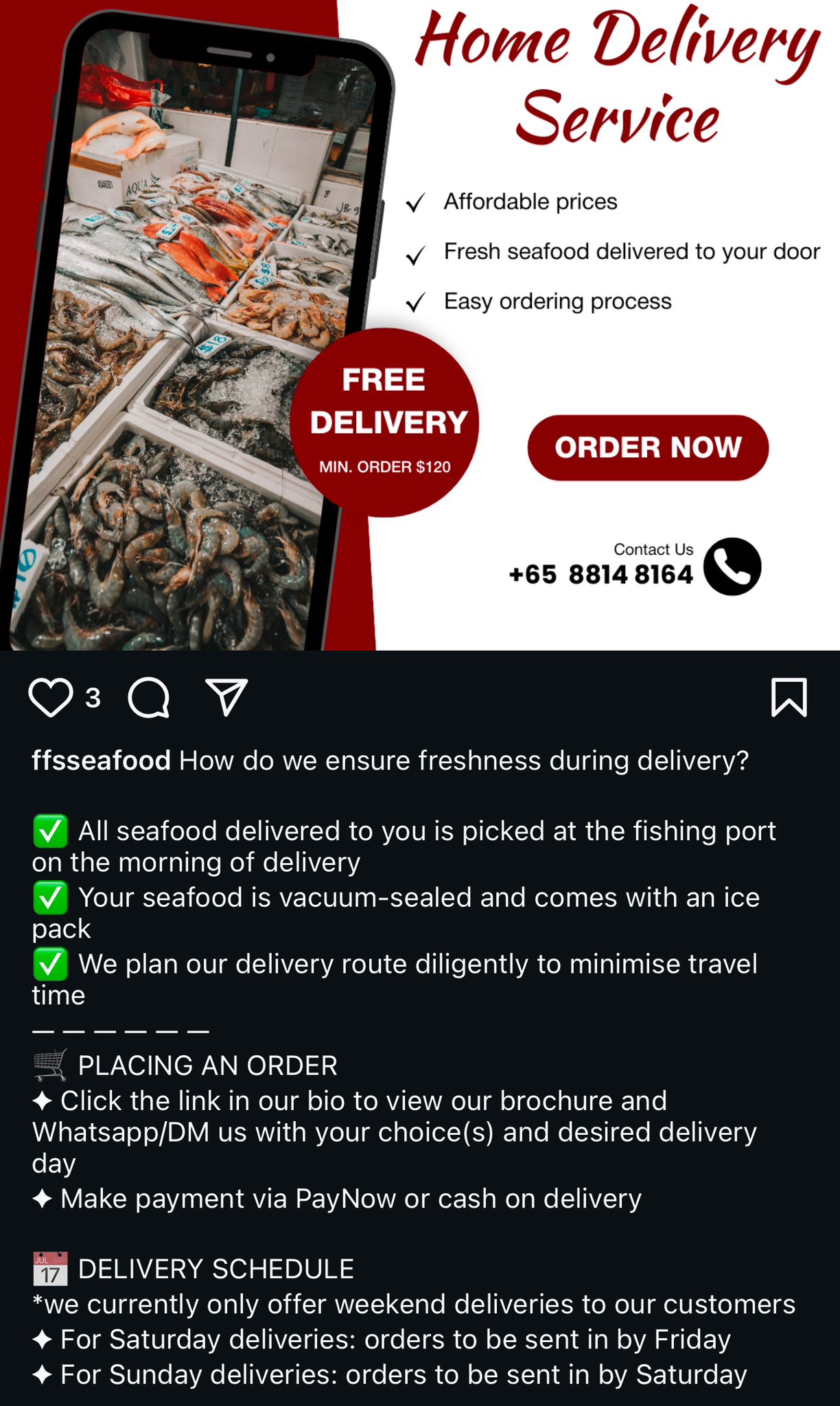 To establish a strong Instagram presence, we included “Seafood Supplier in Singapore” in the name to increase visibility in Instagram’s search results when users input those keywords. We also rewrote the bio to highlight essential information, emphasising the freshness and affordability of the seafood, as well as the locations, opening hours, and business phone number for delivery options. These key details were then translated into visual posts and pinned at the top of the page, ensuring they are the first thing users see and click on when looking for more in-depth information.